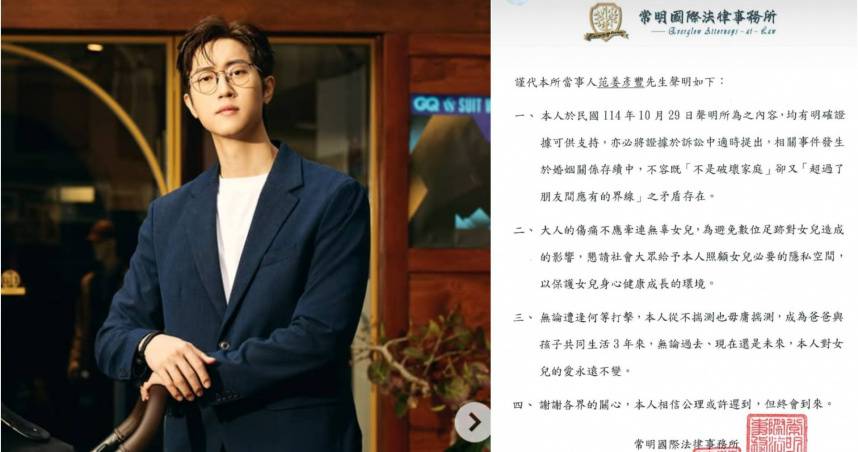 Continue Reading對於妻子粿粿外遇,范姜彥豐再度於社群貼出律師聲明,強調手中握有明確證據,並盼外界給予女兒隱私空間。(圖/翻攝自